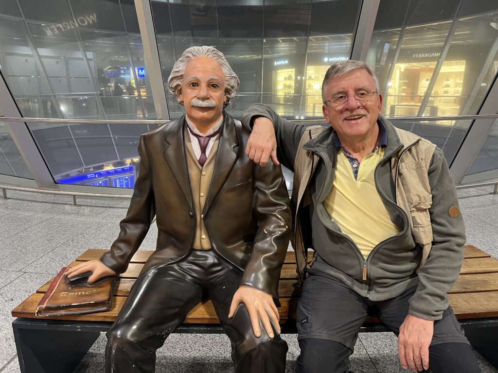 Am Flughafen hatte ich das Vergnügen, neben einem sehr lebensechten älteren Herrn zu sitzen! Anlässlich der heutigen Bekanntgabe der Nobelpreise für Physik hat mir Albert ein wenig über Quantenteilchen und Supraleiter erklärt. Leider trennten sich unsere Wege nach der inspirierenden Unterhaltung. Ich will mit Lufthansa nach Johannesburg, während er mit PanAm zurück nach Princeton wollte.