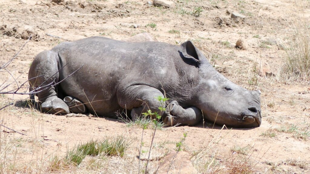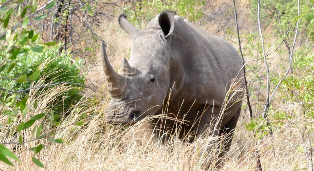 Etwa 250 km nördlich von Johannesburg liegen die Waterberge, mittendrin der Marakele Nationalpark und dort mittendrin ein kleiner Stausee mit feststehenden Zelten. Hohe Berge und grüne Täler, weite Savannen und dichte Dornenwälder, letzteres ein Versteckparadies für Nashörner. Und tatsächlich entdecken wir insgesamt sechs der überaus scheuen Tiere, darunter auch ein Muttertier mit Kind. Interessanterweise ist einigen der Tiere das Horn abgesägt worden, um sie vor Wilderern zu schützen, während andere in voller Pracht durch den Nationalpark laufen. Von den hier lebenden ca. 800 Kapgeier-Paaren, die weltweit größte Brutkolonie, sehen wir nur wenige in weiter Ferne, obwohl wir Toyo eine schmale Passstraße auf über 2.000 Meter hinauf treiben.