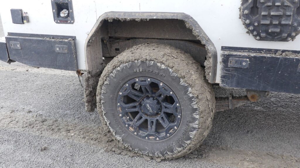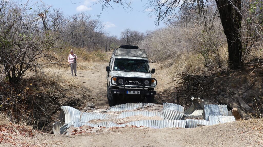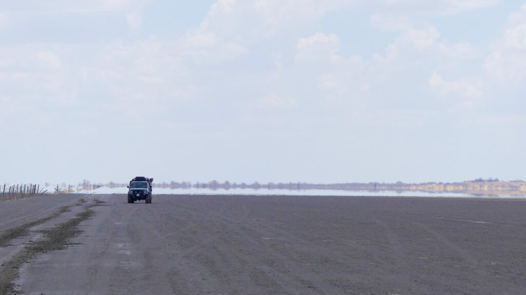 We leave Lethlakane heading east and then turn north to drive along the eastern edge of the Makgadikgadi Pans. These are the largest salt pans in the world, covering an area equivalent to that of Belgium. We visited this surreal, inhospitable, and lifeless yet fascinating landscape 2.5 years ago. Now, we want to showcase it as a highlight of this trip to our friends. The road along the pan is monotonous, but it presents some driving challenges, especially when traversing dried-up riverbeds. Eventually, we take the access road into the salt pan, heading towards Kukonje Island. It truly is an island in the salt, adorned with grass and impressive baobab trees. However, our journey comes to an abrupt halt after just one kilometer. The rains of the past few days have rendered the paths wet, slippery, and muddy, making them impassable. The tires are caked with mud, and the cars slide uncontrollably. During the rainy season (which typically begins in November/December), some areas become so soft that entire vehicles can sink into them. We unanimously decide to retreat, recognizing that our adventure must end here.