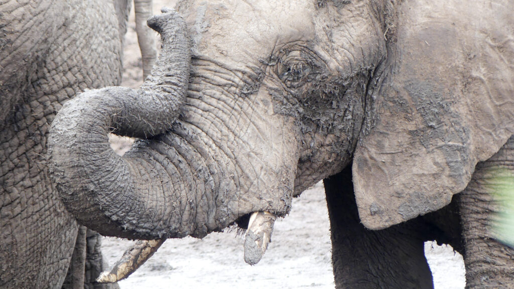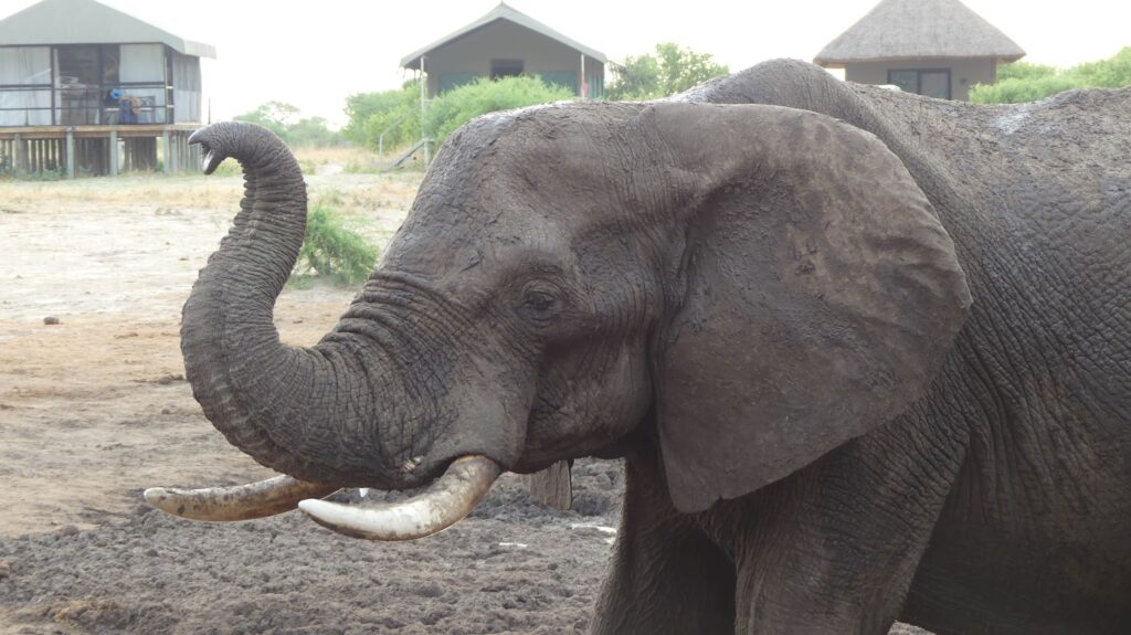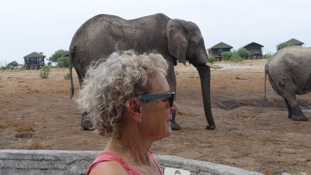 Weil unser Sohn erst vor zwei Wochen in umgekehrter Richtung hier durchgekommen ist und von unserem anstehenden nächsten Camp schwärmte, fahren wir von der Nata-Lodge nur 60 km weiter zur Elephant Sands Lodge – „the place where elephants rule“. Und tatsächlich, noch nicht mal angekommen, kreuzt schon ein junger Elefantenbulle im Tempo eines Mittelstrecklers unseren Weg. Hier gibt es dank einer Brunnenbohrung die einzige Wasserstelle im weiten Umkreis. Elefanten hautnah sind also garantiert!