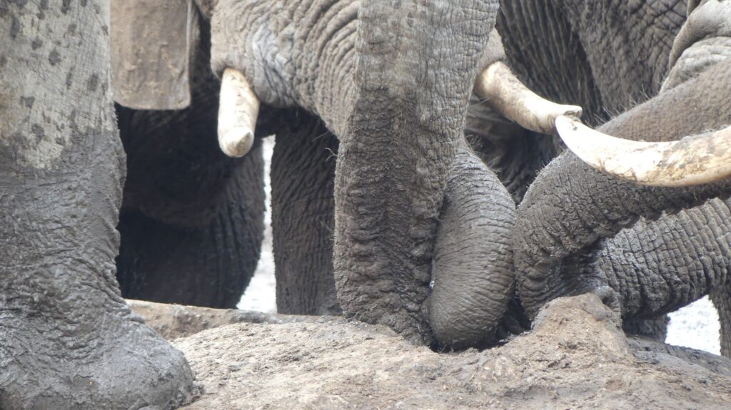 We arrive, watch elephants, have lunch, watch elephants, set up the car, watch elephants, cook dinner, watch elephants, sleep, and surprise, watch elephants again. They are simply always there! We stand, secured only by sharp stones and thorns in the ground, in close proximity to these majestic creatures. It feels like we have a VIP box at the elephant stadium – and they seem to be our audience! Who needs television when the real adventure is happening right outside the door?