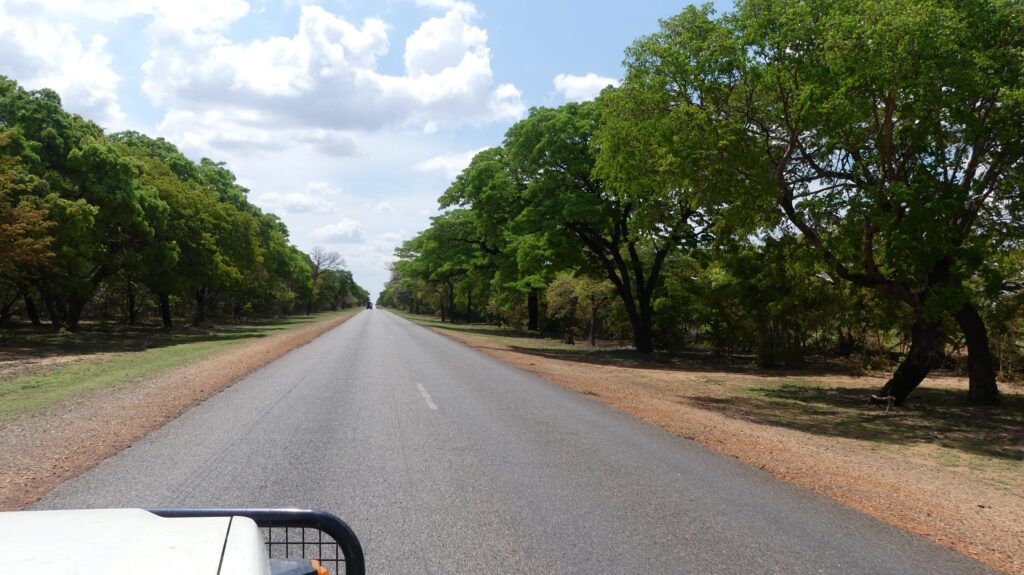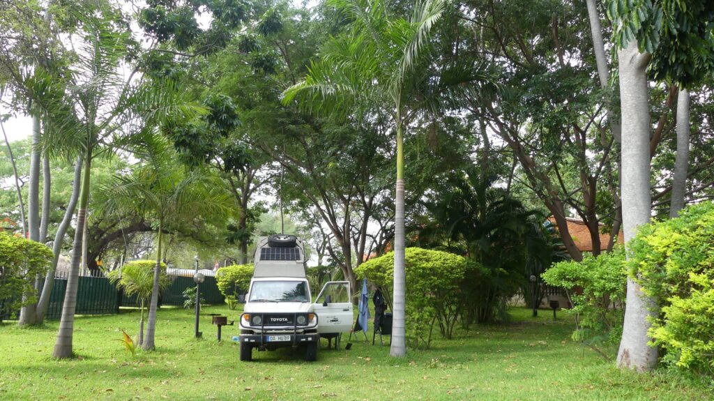 We leave the national park and drive along a picturesque paved road lined with trees that reflect the rain of the past few days, heading towards Victoria Falls, the city located near the country’s most visited attraction. While our four companions opt for the historic Victoria Falls Hotel, we have chosen to spend our last night in the Toyo. We find ourselves in the garden of the N1 Hotel, right by the pool, on the soft grass. As the only campers, we relish the diverse culinary offerings after our sometimes sparse camper meals, ranging from bream to crocodile, and from ostrich to impala. Even more surprising was the breakfast at a bustling café, where along with our two ordered cappuccinos, we are served a glass of Amarula each. At 9 a.m. in the morning – that’s a real treat.