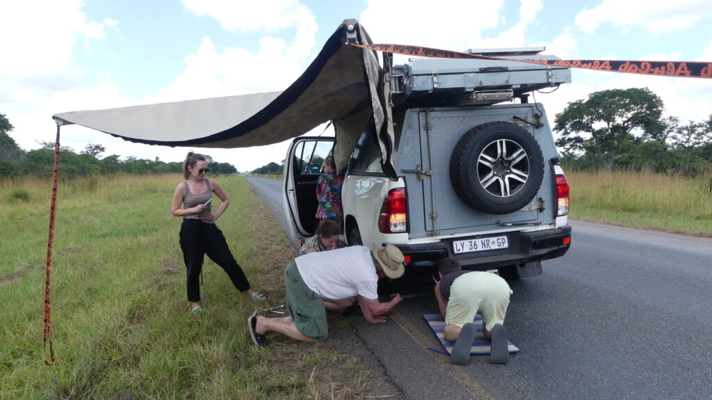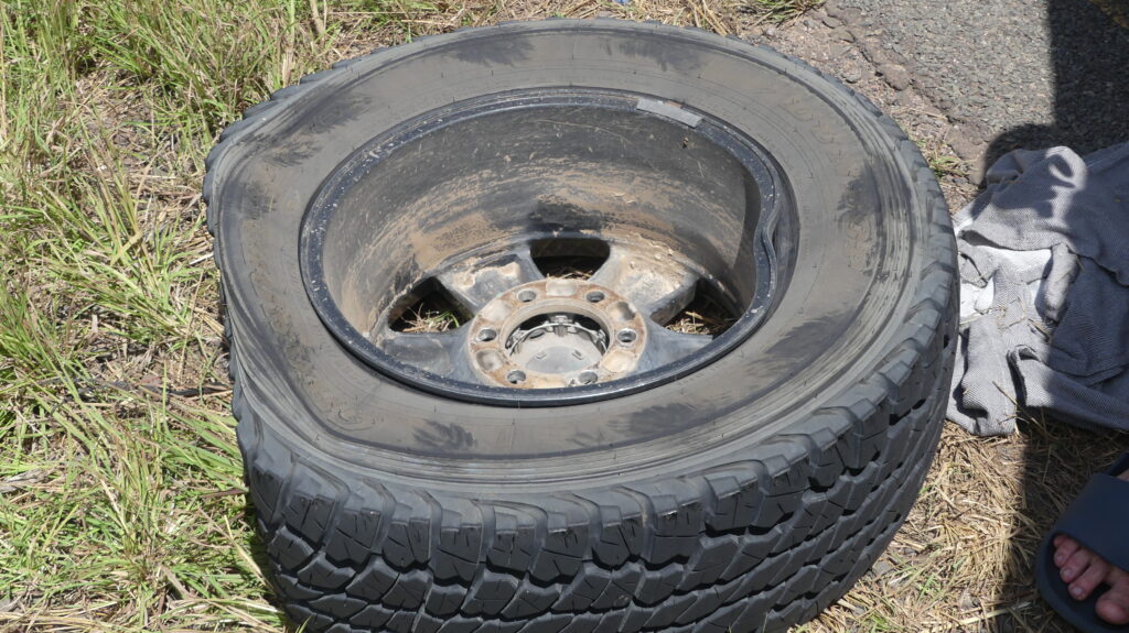 From Kasane and Chobe National Park, we head south toward Pandamatenga on the way to Nata. We know the road gets worse the further south you go. The first 40 km are surprisingly (too) good. Then comes the onslaught of potholes — an entire brigade stretching across the road, with no way to avoid them. The survival strategy? Brake hard. But our son Chris drives straight into them without slowing down. A loud bang confirms our worst fears: the tire is completely mangled, and worse, the rim took a deep hit and will never hold air again.
