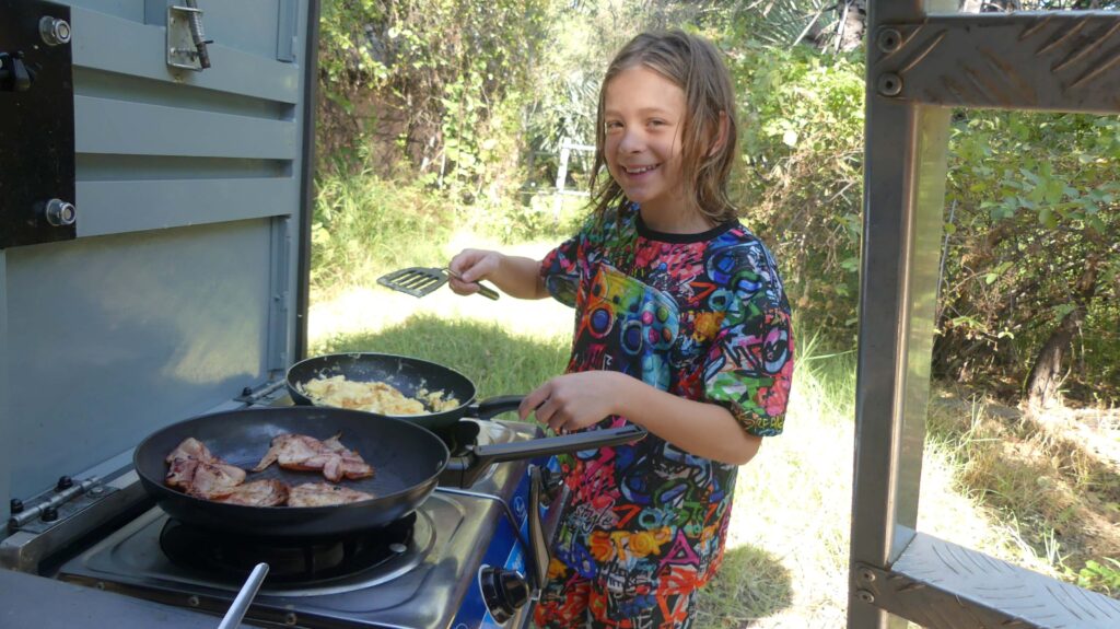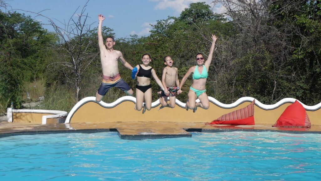 After we had solved our tire problem, we drove to Nata, where at a gas station pump I nicked a piece off the tire’s sidewall. Another tire change. Still, we head on in good spirits to Gweta. The camp “Planet Baobab” used to be our starting point for a trip across the salt pan to the idyllic Kubu Island. This year, that’s out of the question. Too much water. We therefore decided to go for a swim ourselves.