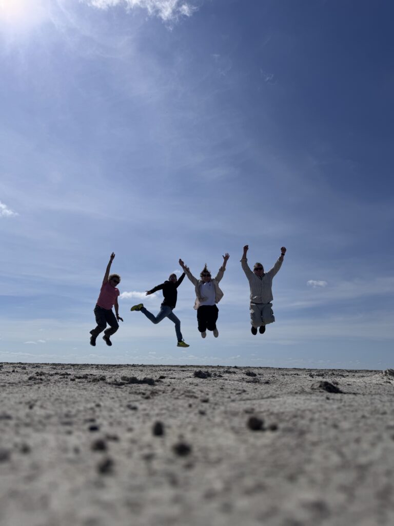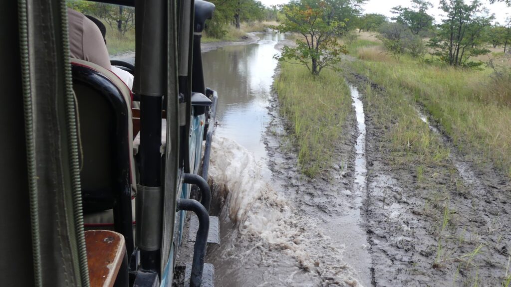 In Makgadikgadi National Park we visit a meerkat colony with the Planet Baobab crew. Departure is ridiculously early: 05:30. The ride treks across flooded roads. Good thing we’re not in our Toyo, so we can lean back and chill. Yet even the guide daren’t take on the Ntwetwe Salt Pan. On the surface it looks already dry after months of rain, but underneath there’s so much water that any car would instantly sink and be lost. Salt, savannah, sun—that’s just African charm.