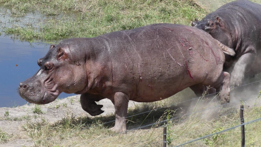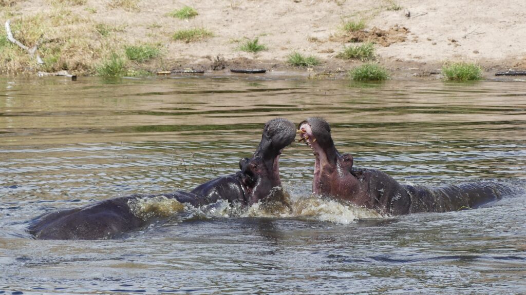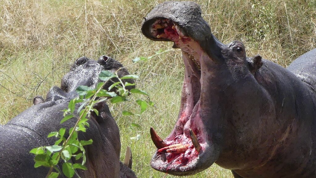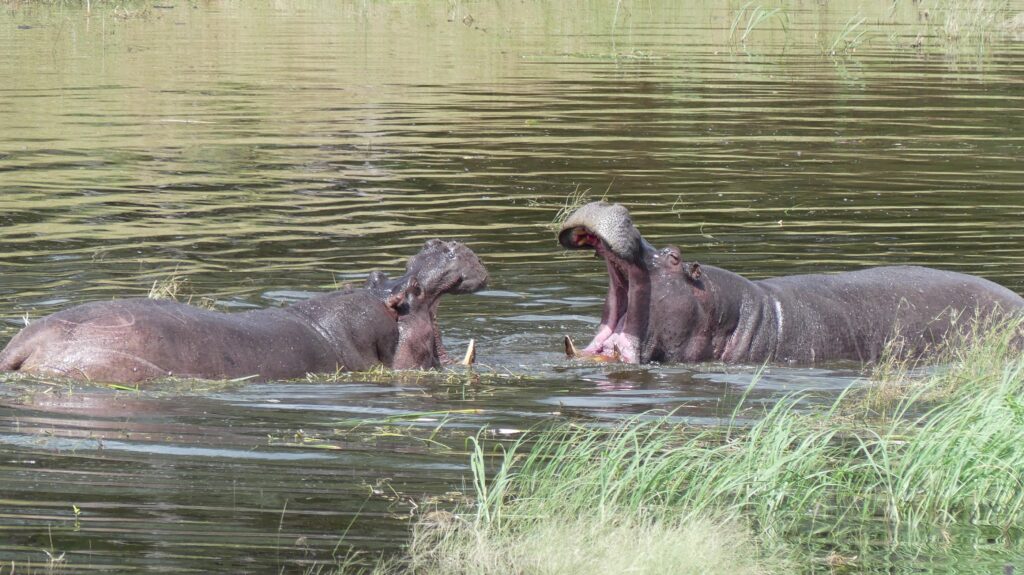 Wir fühlen uns an 1974 erinnert: Der größte Boxkampt aller Zeiten, zwischen Muhammad Ali und George Foreman im ehemaligen Zaire. Ein Hippo-Bulle verteidigt sein Revier und seine Weibchen gegen zwei jugendliche Eindringlinge. Der Kampf dauert fast eine Stunde und endet blutig – zugunsten des Revierinhabers..
