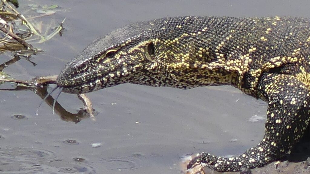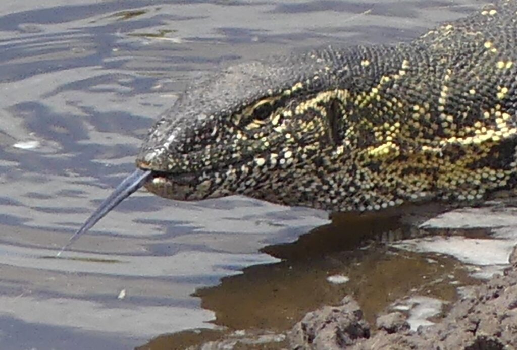 This time it’s not a waterhole, but the meandering Boteti River, which we have in view from the observation deck at Camelthorn Farmstead Camp. The kids insisted on heading back into the park one more time, while we were hoping to settle down with a good book—and of course we still don’t manage to read. Someone is always putting on a show, and we’re in the front row when monitor lizards and elephants stroll by.
