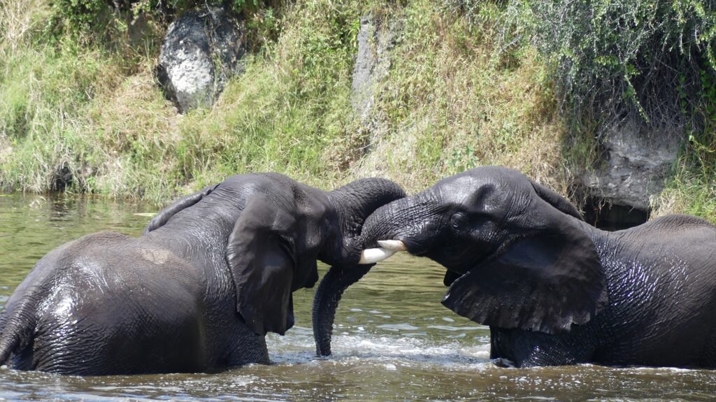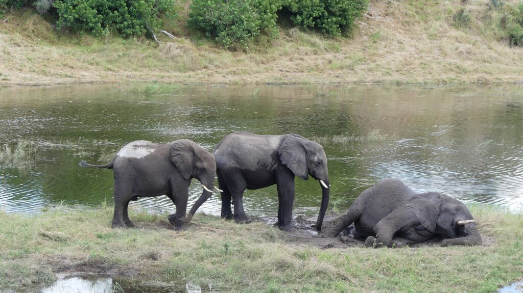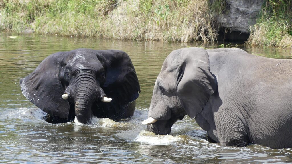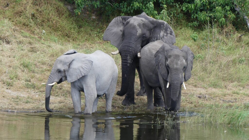 Ich korrigiere gleich zum Einstieg: In diesem Jahr ist es kein Wasserloch, sondern der gemächlich dahinfließende Boteti River, den wir vom Beobachtungsdeck der Camelthorn Farmstead Camp im Blick haben. Die Kinder mussten unbedingt noch einmal in den Nationalpark, wir chillen mit einem guten Buch – und natürlich klappte das mit dem Lesen wieder mal nicht. Ständig zieht jemand eine Show ab und wir sitzen in der ersten Reihe, wenn Warane und Elefanten vorbeischauen.